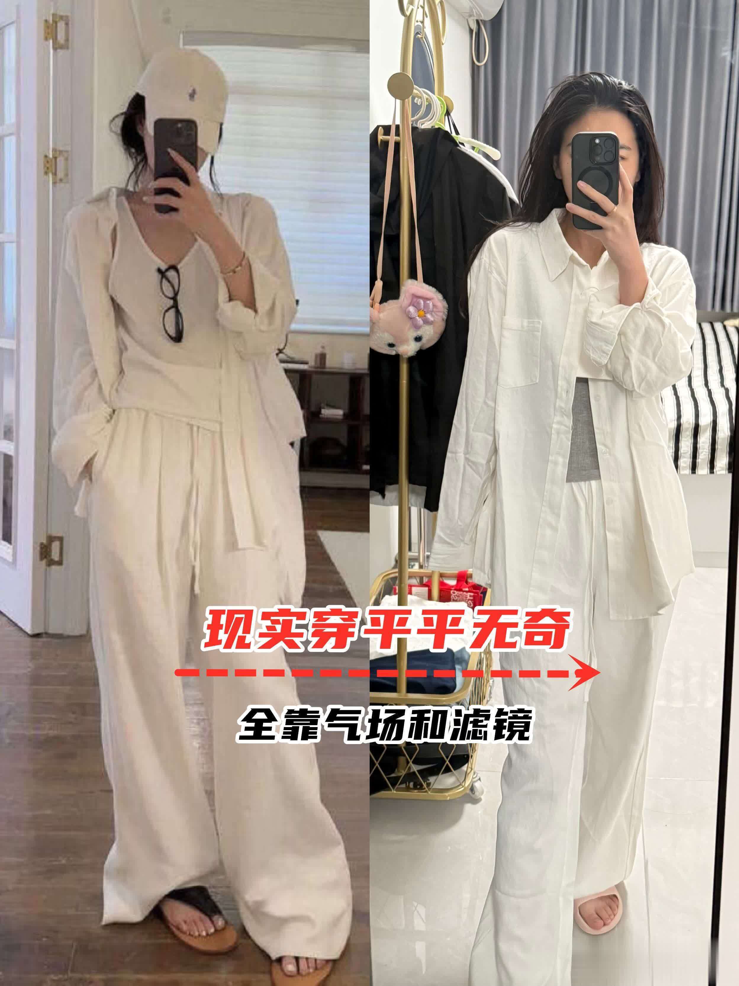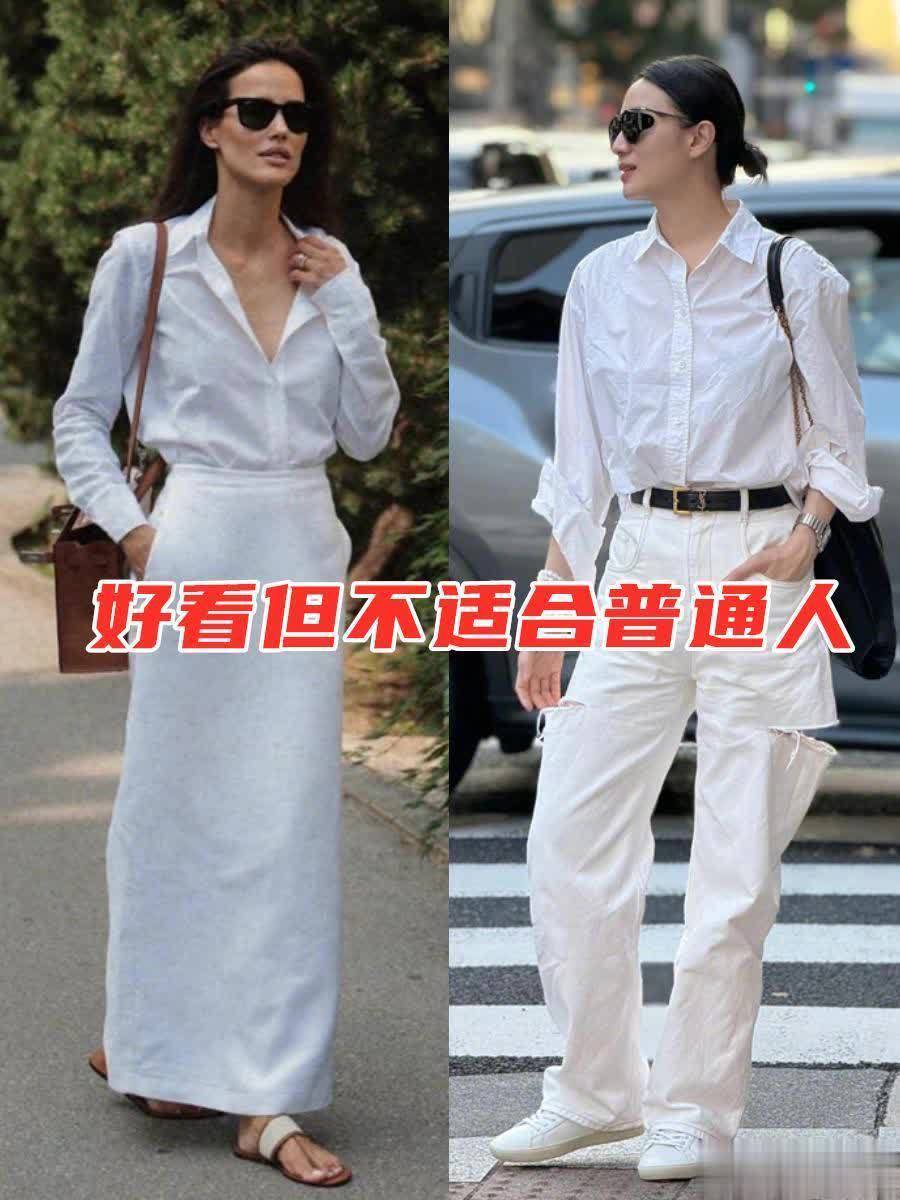 加上一身白缺乏层次感,容易显得单调乏味。除非你的气质和身材都非常出众,否则很难穿出惊艳的高级感。▼▼